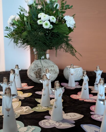Die Engelfiguren erinnern uns daran, dass jeder Mensch behütet und getragen ist, im Leben wie im Sterben. Die Schmetterlinge stehen für die Verwandlung unseres Daseins: dafür, dass das Leben nicht endet, sondern sich wandelt und in Gottes Liebe aufgehoben bleibt.